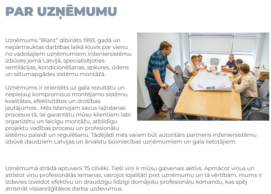 Uzņēmums “Biant” dibināts 1993. gadā un nepārtrauktas darbības laikā kļuvis par vienu no vadošajiem uzņēmumiem inženiersistēmu izbūves jomā Latvijā, specializējoties ventilācijas, kondicionēšanas, apkures, ūdens un siltumapgādes sistēmu montāžā.