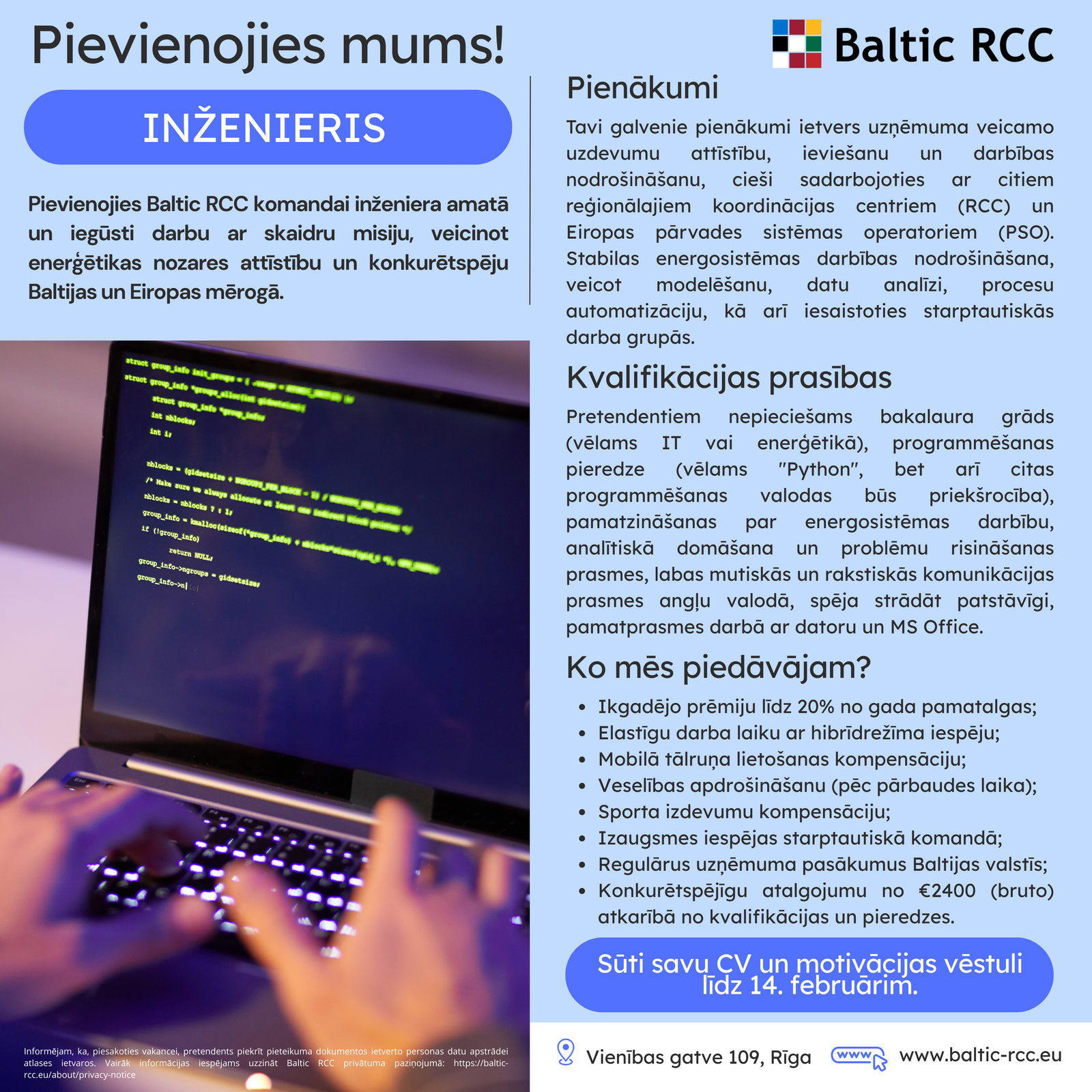 Sūti savu CV un motivācijas vēstuli sadaļā "PIETEIKTIES" līdz 14. februārim!