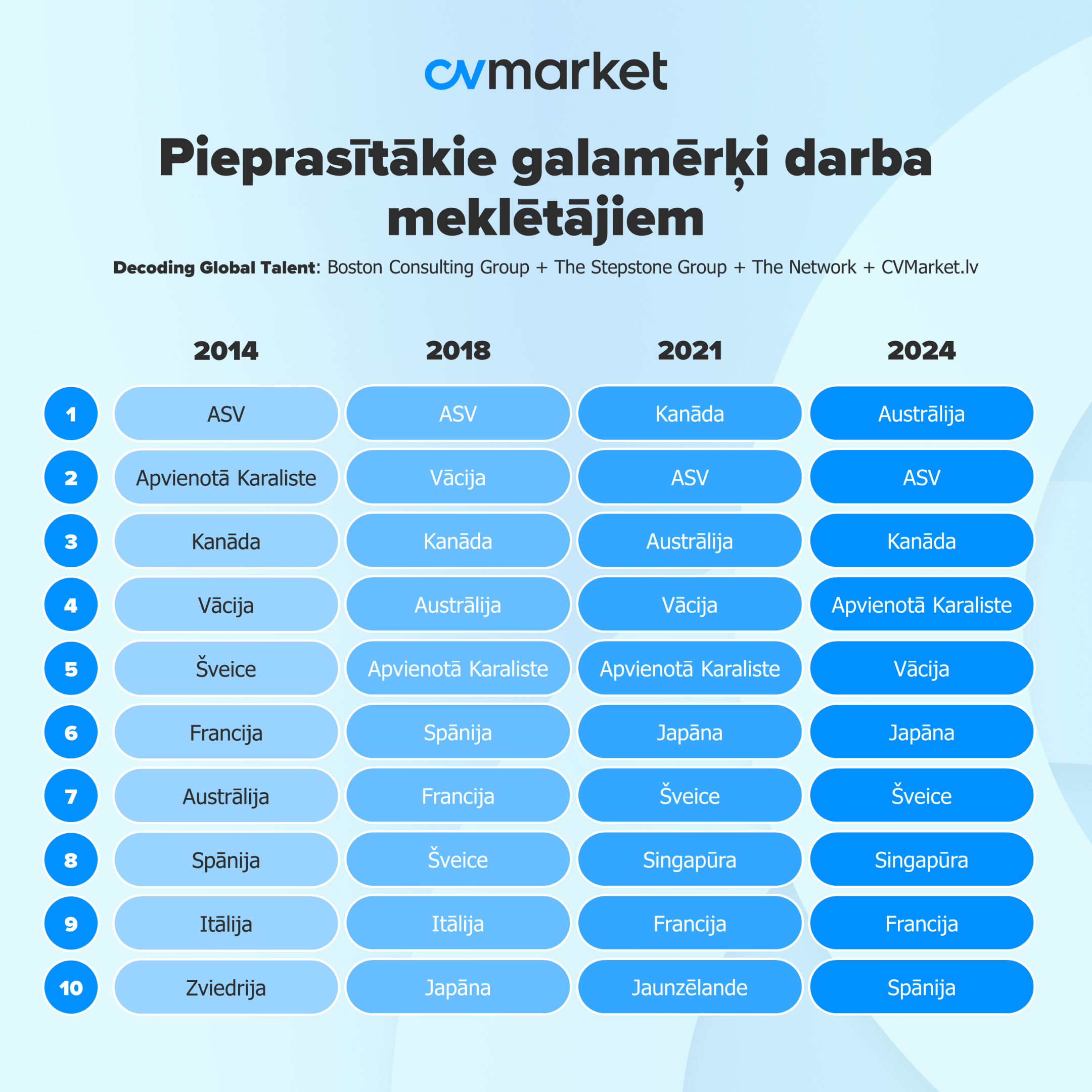 “Decoding Global Talent” ir starptautisks darba tirgus pētījums, ko reizi četros gados veic Boston Consulting Group, The Stepstone Group un The Network, kas apvieno pasaules vadošās darba vietnes, tostarp CVMarket.lv. Pētījuma mērķis ir izprast pieprasītākos darba meklētāju galamērķus un mobilitātes tendences. 2024. gadā pētījumā piedalījās 150 735 cilvēki no 188 valstīm.